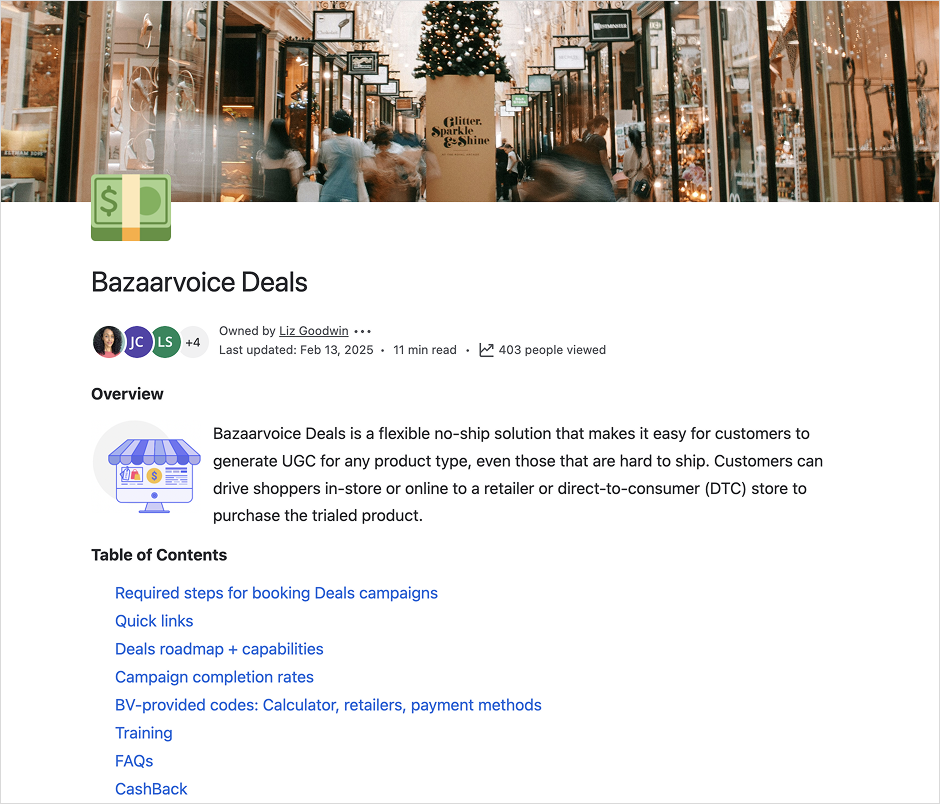 I also created an internal knowledge base as an information hub for Bazaarvoice Deals. I wrote all the content for it and maintained the page over time.
