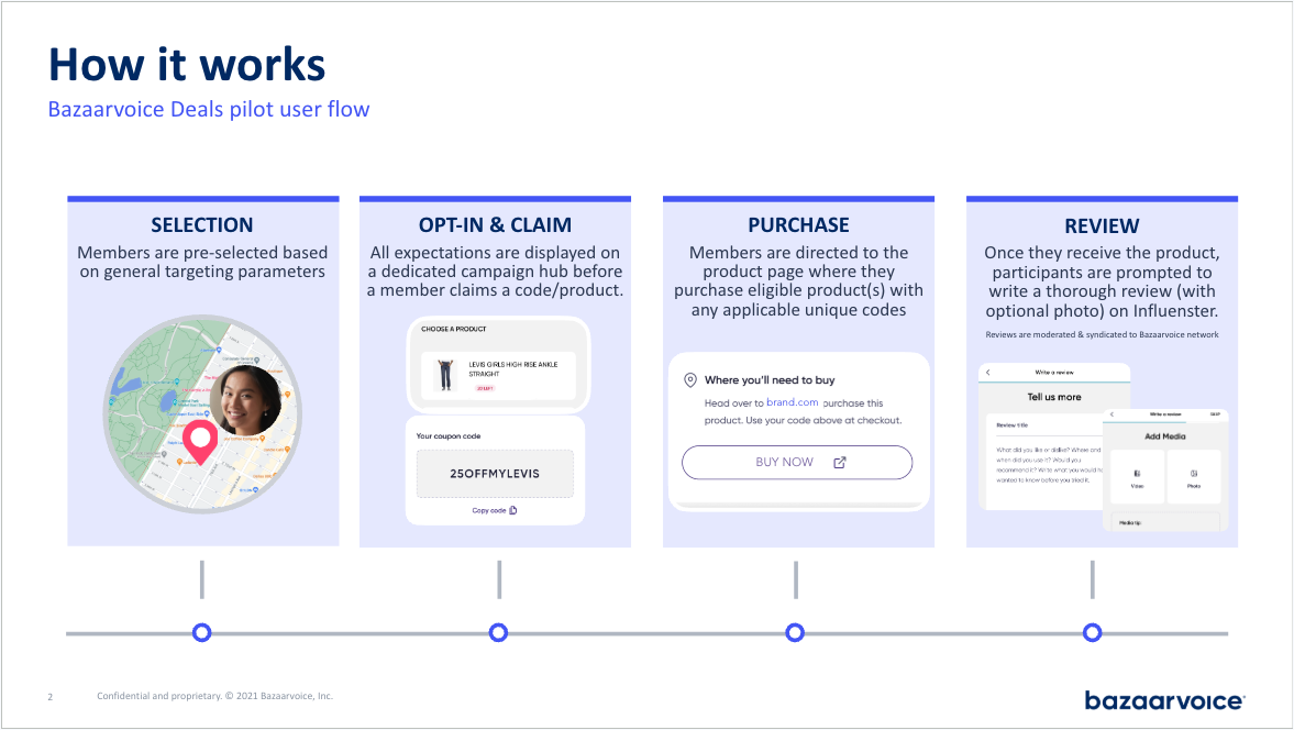 With many sampling competitors in the market that also offer no-ship solutions, it was important to research their strengths, weaknesses, and capabilities. I shared the intel with the products team to help them prioritize the roadmap. I also used this information to flesh out positioning. I wanted to emphasize what made Bazaarvoice Deals valuable and the best solution for our customers.